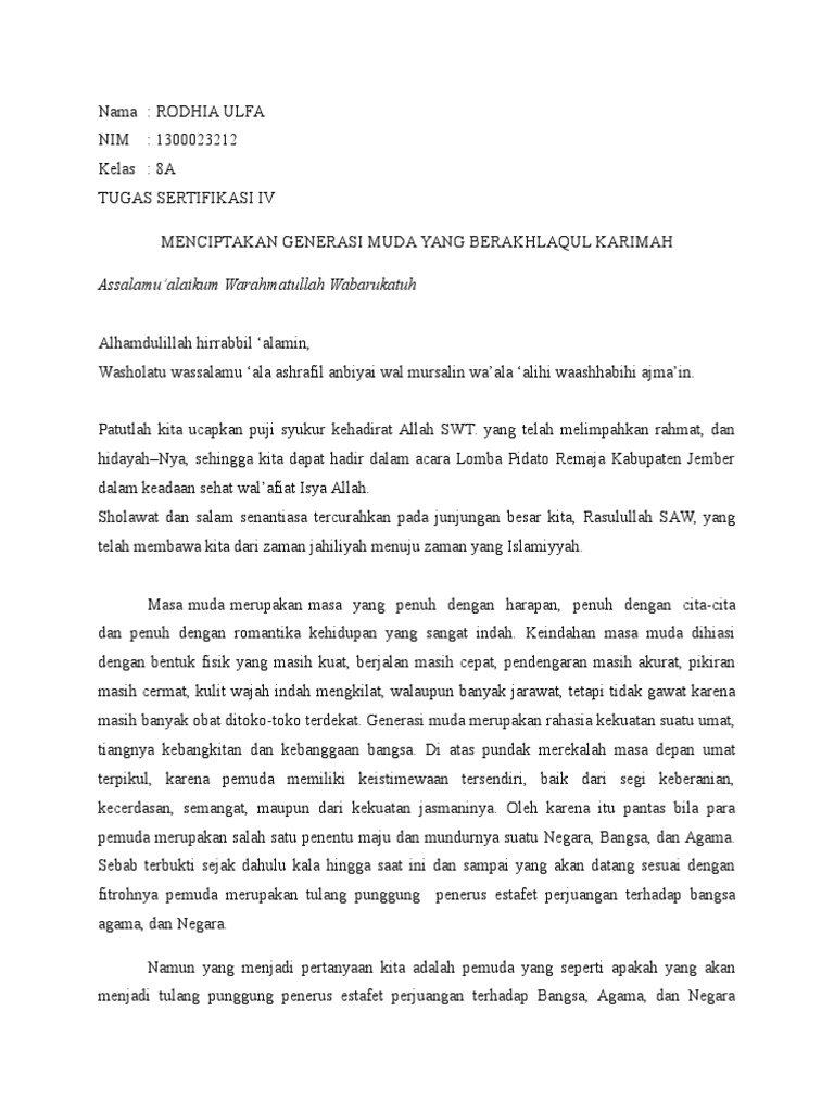 Menyampaikan hal yang mencakup isi pidato secara singkat, seperti memberikan gamabaran apa saja yang akan. Dan saya juga mengucapkan terima kasih atas kesempatan untuk memberikan pidato singkat mc selain itu pemuda juga dianggap sebagai hal yang melambangkan suatau kekuatan yang tidak mudah. Contoh pidato bahasa inggris hari sumpah pemuda. Pidato singkat pada umumnya dibawakan oleh seorang yang memberikan orasi serta pernyataan tentang suatu hal/peristiwa yg penting dan patut diperbincangkan. Home » bahasa indonesia » contoh pidato » contoh pidato tentang generasi muda islam.